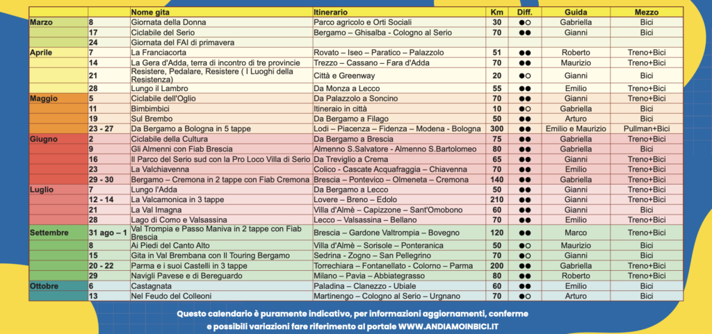 Si va verso la fine dell’inverno (ma è mai cominciato, a proposito di surriscaldamento del pianeta?) e già si inizia a progettare le uscite in bici per la primavera. Il calendario gite di Pedalopolis è pronto, con percorsi lunghi, corti, vicini, lontani e su più giorni. Ce n’è per tutti! I dettagli delle gite saranno disponibili a breve su Andiamo in Bici (il calendario nazionale degli eventi FIAB). Se poi volete approfondire il tema del turismo lento il 16, 17 e 18 febbraio ci trovate alla Fiera di Bergamo per Agritravel Expo con uno stand FIAB per scoprire insieme tutte le forme di turismo lento.